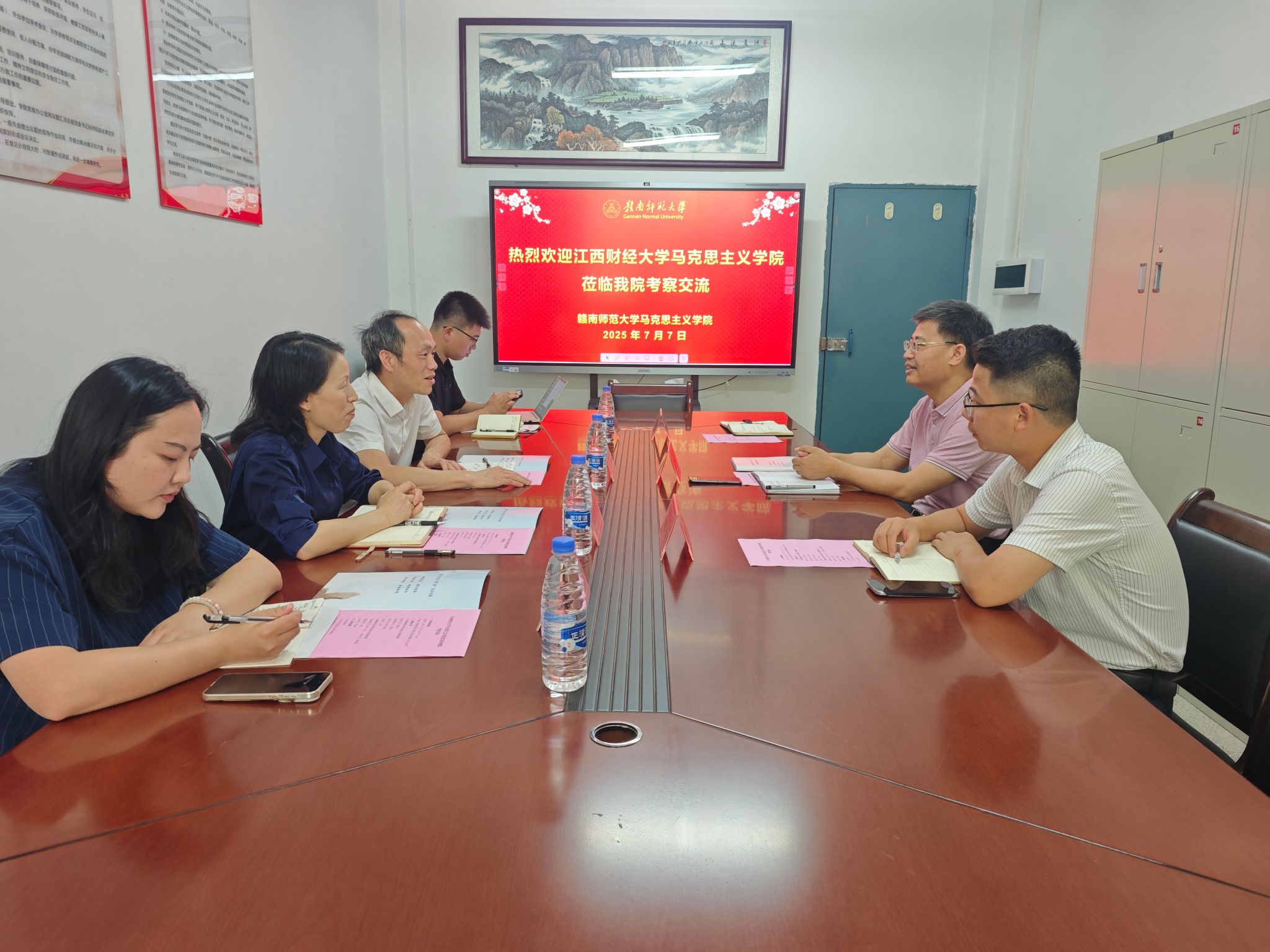 7月7日,江西财经大学马克思主义学院党委书记肖建文一行莅临我院交流,双方在博爱楼124会议室开展交流座谈,我院党委副书记曾建国、学工办负责同志、党委组织员参加座谈。