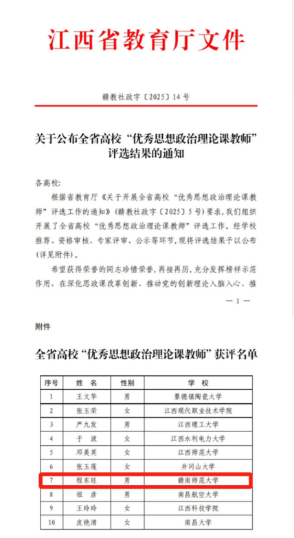 近日,江西省教育厅发布《关于公布全省高校“优秀思想政治理论课教师”评选结果的通知》,我院教师程东旺成功获评全省高校“优秀思想政治理论课教师”。