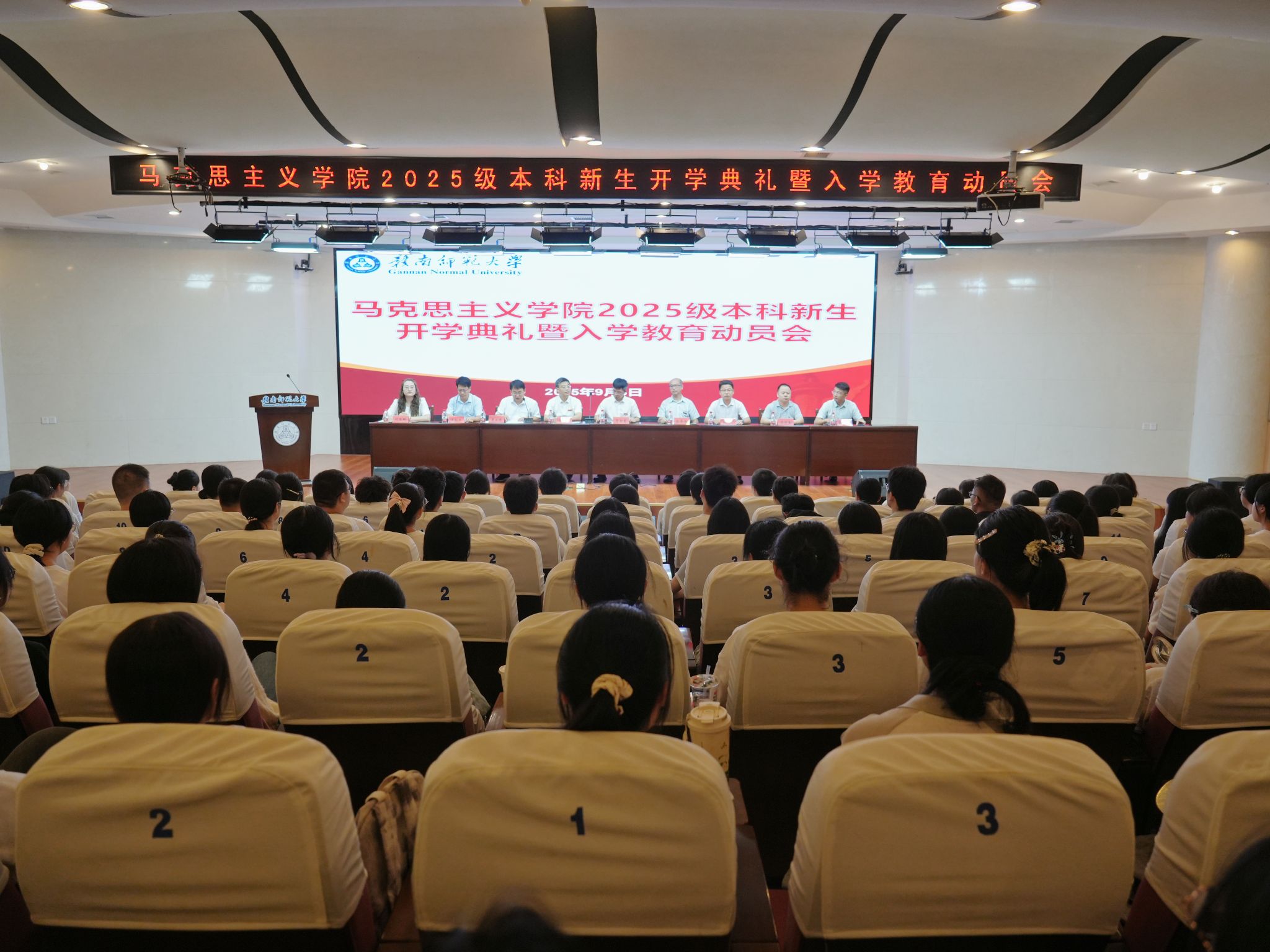 9月8日,马克思主义学院在图书馆科报厅举办2025级本科新生开学典礼暨入学教育动员大会,学院院长贺新春、党委副书记曾建国、副院长彭景涛出席,新生辅导员、班主任、师生代表和2025级全体新生参加,副院长康安峰主持。