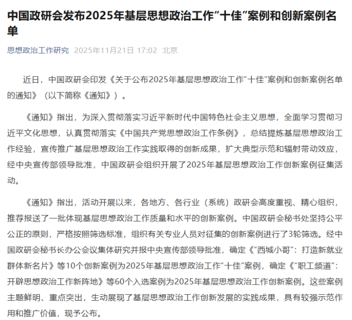 近日,中国思想政治工作研究会印发《关于公布2025年基层思想政治工作“十佳”案例和创新案例名单的通知》,我院申报的《打造“红色轻骑兵” “声”入人心青年行》成功入选2025年基层思想政治工作创新案例,全省仅有两个案例入选,也是全省唯一入选的高校案例。