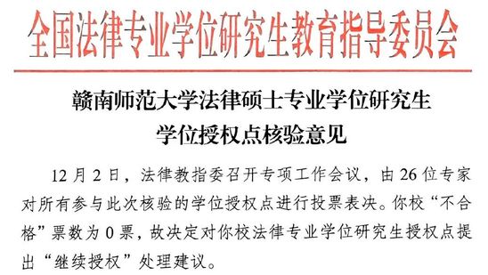 12月5日,全国法律专业学位研究生教育指导委员会下发《赣南师范大学法律硕士专业学位研究生学位授权点核验意见》文件,文件指出:“12月2日,法律教指委召开专项工作会议,由26位专家对所有参与此次核验的学位授权点进行投票表决。你校‘不合格’票数为0票,故决定对你校法律专业学位研究生授权点提出‘继续授权’处理建议。”