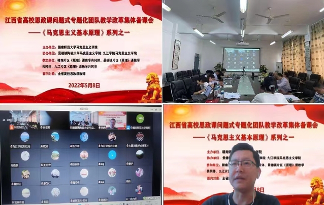 为贯彻落实习近平总书记“3·18”重要讲话精神和4月25日在中国人民大学考察时的重要讲话精神,贯彻落实中共江西省委教育工委、江西省教育厅有关文件精神,深入推进思政课问题式专题化团队教学改革,2022年5月8日上午,我校举办全省高校《原理》课问题式专题化团队教学改革集体备课会。会议由赣南师范大学马克思主义学院主办,景德镇陶瓷大学马克思主义学院、九江学院马克思主义学院协办,以各校线下集中、校际腾讯会议的方式举行。参加的单位有赣南片区《原理》课教学共同体高校、景德镇片区《原理》课教学共同体高校、九江片区《原理》课教学共同体高校等28所高校。复旦大学马克思主义学院院长、马克思主义研究院院长,教育部青年长江学者、博士生导师李冉教授通过视频会议出席集体备课会,并进行了专家点评指导。会议由赣南师范大学马克思主义学院程东旺教授主持,学院领导和《原理》课教学团队全体成员参加。