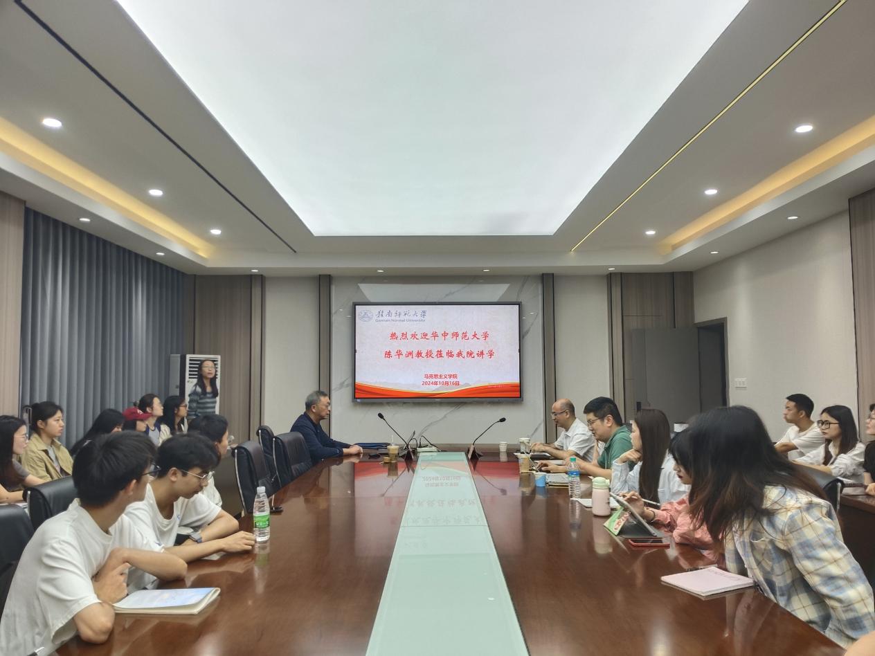 10月16日,华中师范大学马克思主义学院思想政治教育系主任、博士生导师陈华洲教授应邀来院讲学,2024级马克思主义理论、学科教学(思政)专业研究生聆听报告,学院副院长彭景涛主持。